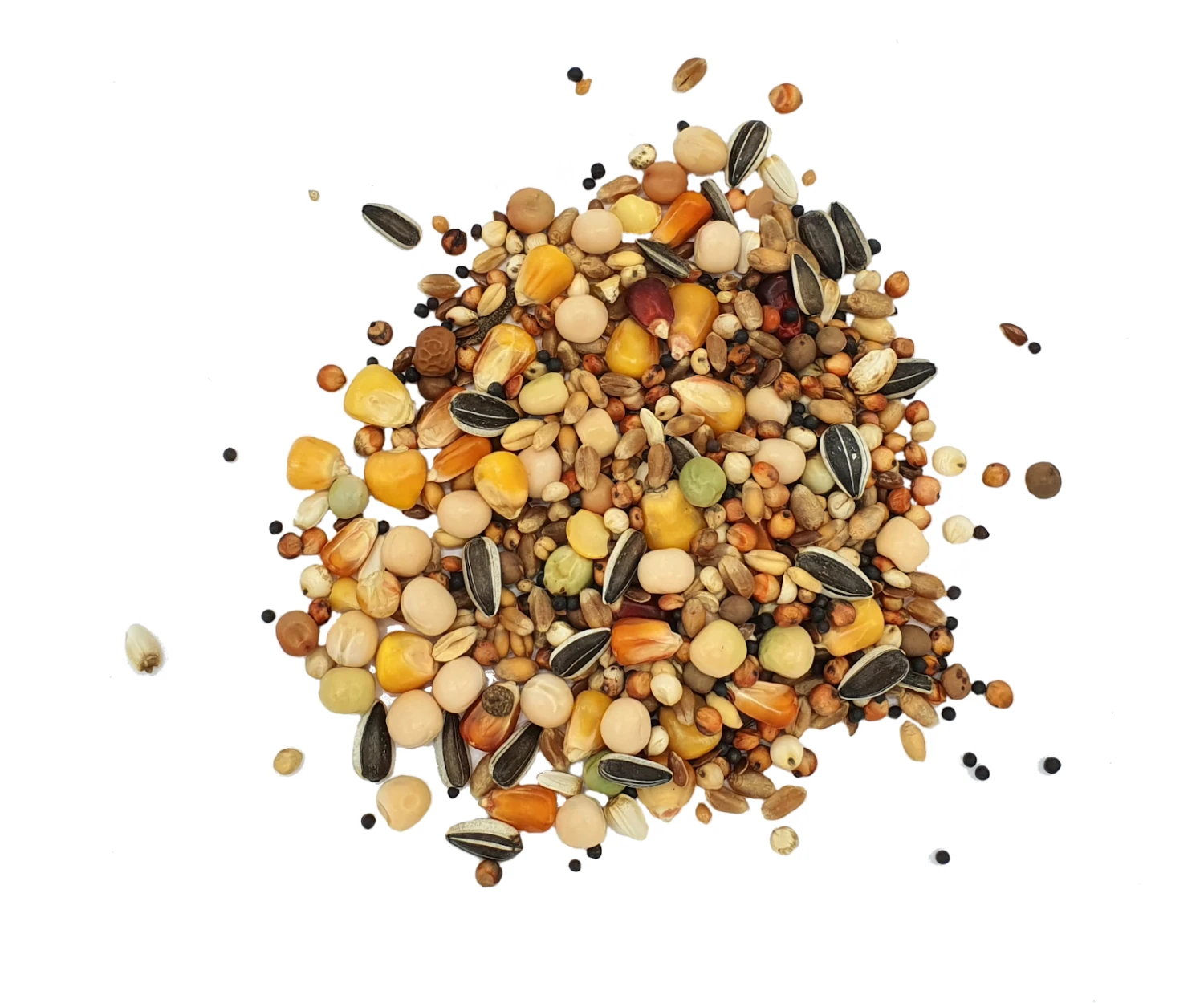 Weizen hell, Cribbsmais gelb, Milokorn rot, Erbsen gelb, Dari weiß, Wicken, Dunpeas Erbsen, Kardysaat, Sonnenblumenkerne gestreift, Rubsen, Leinsaat, Cribbsmais Bordeaux, Hirse weiß